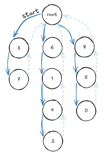 How could you describe this layout without giving the exact coordinates of any of the blocks? You could start by telling which blocks are furthest to the left. (Or furthest to any of the four sides, but conventionally the left is chosen.) So, at the very left of this layout, from bottom to top, there’s 3, then 6, then 8. That’s the first level of the tree. Any blocks immediately to the right of one of those is a child to that block, and so on. [1]